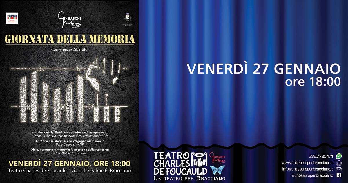 "Giornata della Memoria" - Conferenza-Dibattito @ Teatro Charles de Foucauld - Un Teatro per Bracciano Generazione Musica presenta: “Giornata della Memoria”- Conferenza-Dibattito. con la partecipazione di Dario Cavinato, storico e presidente dell’ANPI Bracciano, Arturo Belluardo, scrittore. Introduzione di Alessandro Lembo, associazione Generazione Musica. La data del 27 gennaio come Giorno della Memoria è stato scelto […]