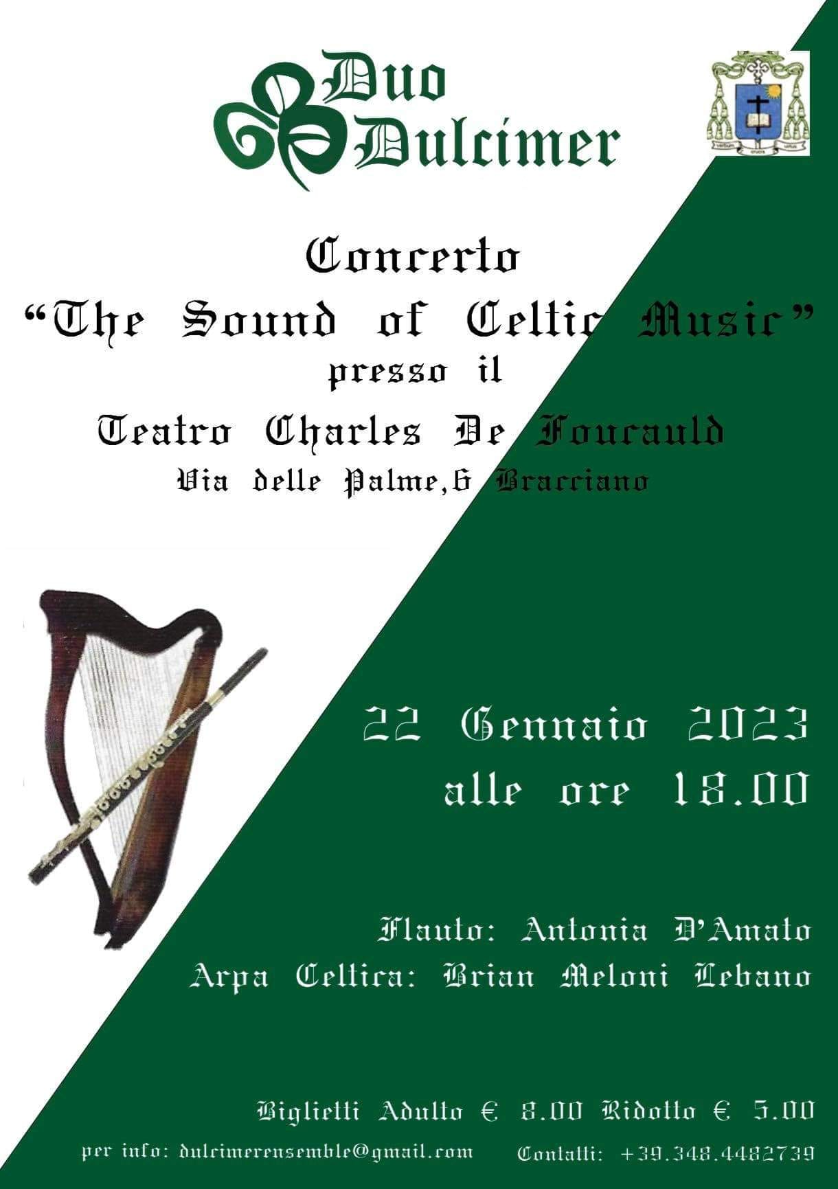 “The Sound of Celtic Music” 22 Gennaio 2023 alle ore 18:00 presso il Teatro Charles De Foucauld a Bracciano Il programma molto suggestivo sarà composto da anonimi della tradizione medioevale irlandese, scozzese e bretone del sec. XVI - XVII - XXVIII. Flauto: Antonia d'Amato Arpa Celtica: Brian Meloni Lebano