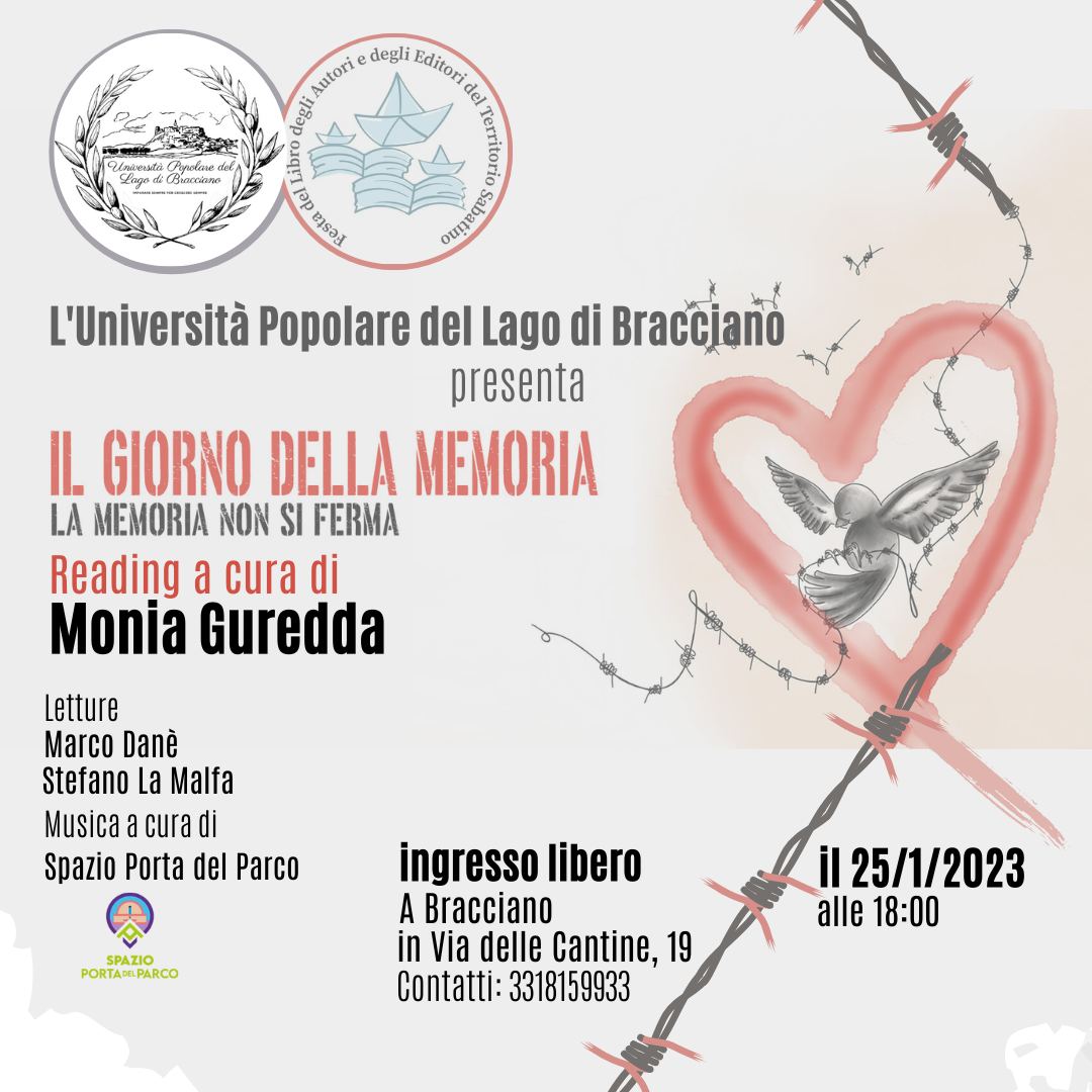 Unipop Bracciano presenta: Il giorno della Memoria Mercoledì 25 gennaio 2023 alle 18:00 Università Popolare del Lago di Bracciano, A.N.P.I. Sez. di Bracciano, Spazio Porta del Parco, tutti insieme per celebrare “Il Giorno della Memoria”! Il Reading che Monia Guredda ci propone vede al centro “Destinatario Sconosciuto”, un libro di Kressmann Taylor, un brevissimo romanzo […]