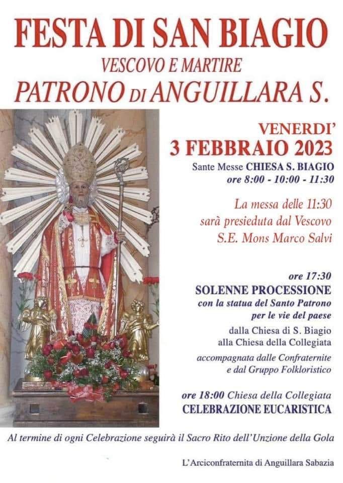 Festa di San Biagio, patrono di Anguillara Sabazia, venerdì 3 febbraio Sante Messe CHIESA S. BIAGIO ore 8:00 - 10:00 - 11:30 La messa delle 11:30 sarà presieduta dal Vescovo S.E. Mons Marco Salvi ore 17:30 SOLENNE PROCESSIONE con la statua del Santo Patrono per le vie del paese dalla Chiesa di S. Biagio alla […]