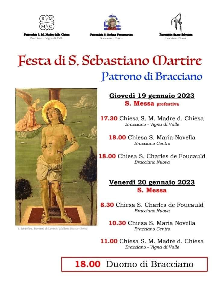 Festa di San Sebastiano Martire patrono di Bracciano Giovedì 19 gennaio 2023 S. Messa prefestiva 17.30 Chiesa S. M. Madre d. Chiesa Bracciano - Vigna di Valle 18.00 Chiesa S. Maria Novella Bracciano Centro 18.00 Chiesa S. Charles de Foucauld Bracciano Nuova Venerdì 20 gennaio 2023 S. Messa 8.30 Chiesa S. Charles de Foucauld Bracciano […]