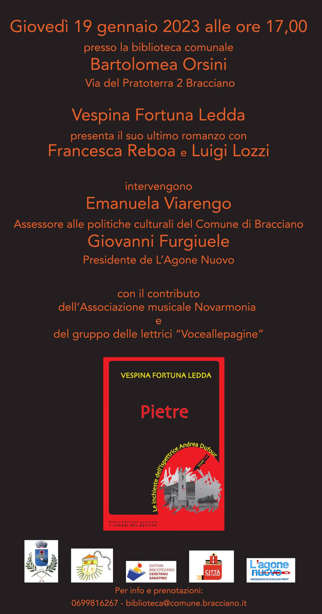 Presentazione del libro "Pietre" di Vespina Fortuna Ledda Con il nuovo anno ricominciamo con le presentazioni libri, vi aspettiamo quindi il 19 gennaio alle ore 17:00 in biblioteca per conoscere insieme l'ultimo libro di Vespina Fortuna Ledda dal titolo "Pietre".
