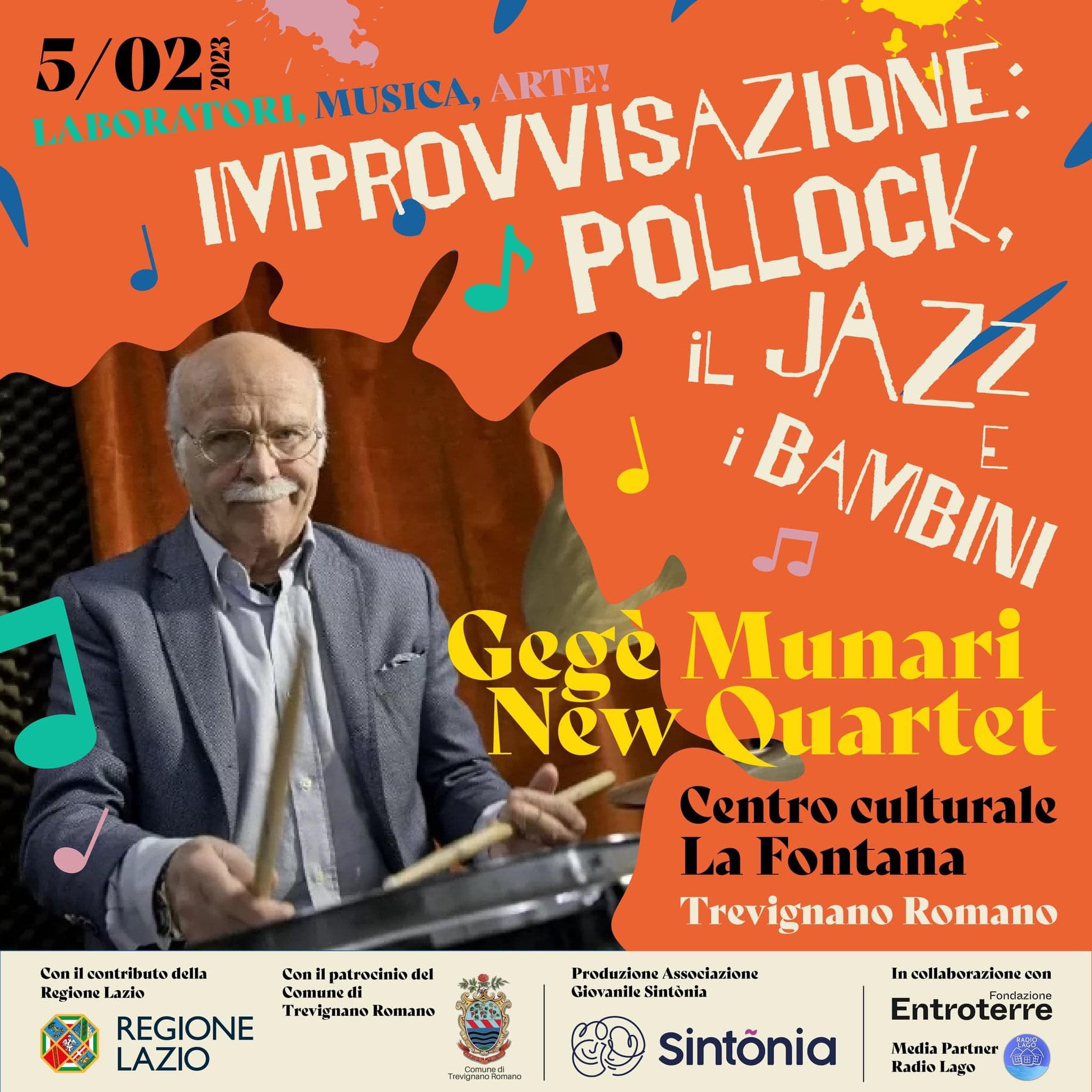 Centro culturale La Fontana: Improvvisazione Pollock, il jazz e i bambini Domenica 5 febbraio 2023 Concerto e laboratorio di pittura in movimento, tenuto da Elisa Argentesi, con la tecnica del dripping (sgocciolatura). I bambini dipingeranno su una grande tela stesa a terra, a ritmo di jazz suonato dal vivo dalla band GEGE' MUNARI NEW QUARTET.