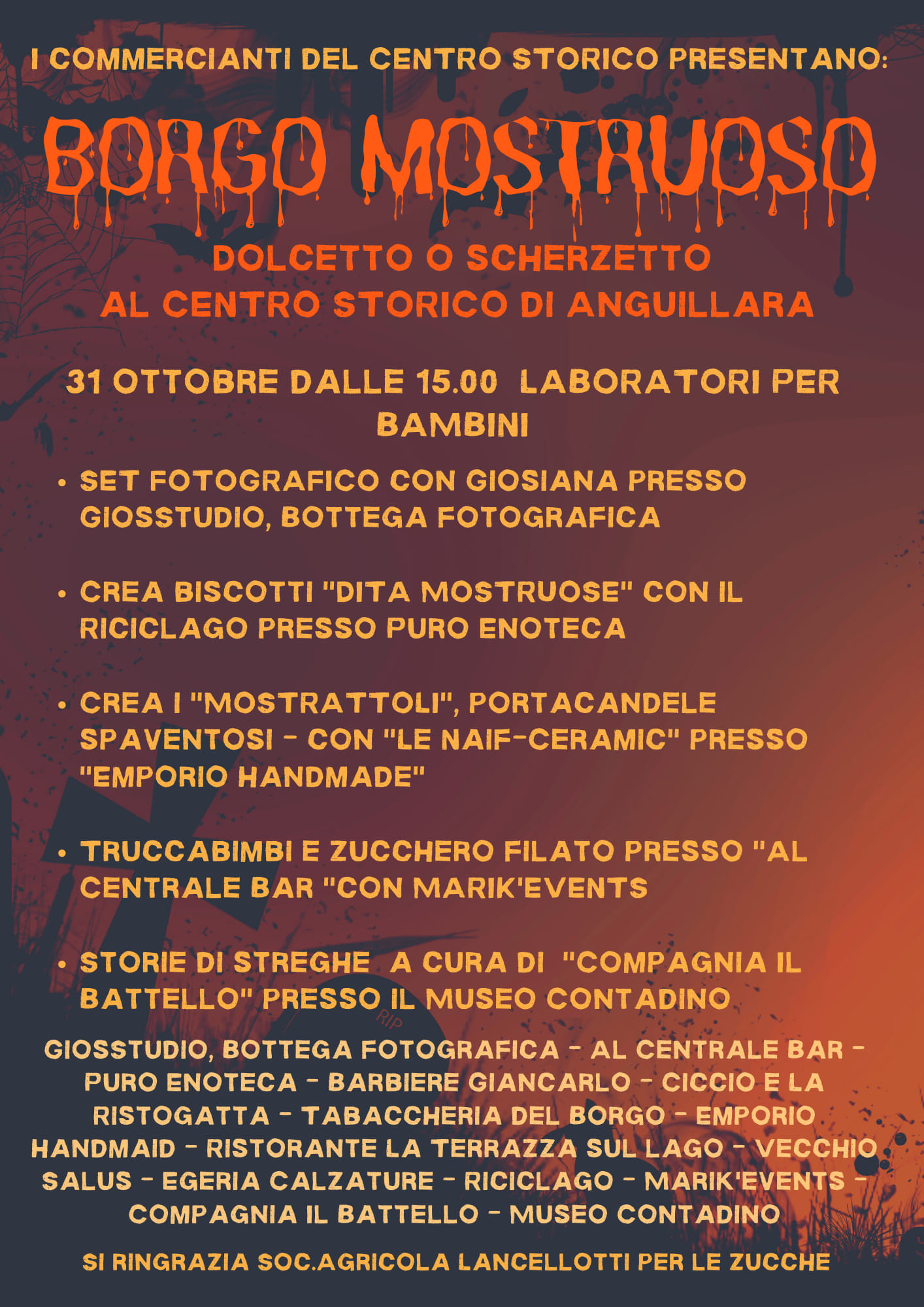 Il borgo mostruoso è organizzato dai commercianti del centro storico: Al Centrale, Puro Enoteca, Le Naïf Ceramic LAB, Ristorante Ciccio e La Ristogatta, La terrazza sul lago, Calzature Egeria, Gios Fotografia, Vecchio Salus, Marik’Events, Tabaccheria del borgo, Domus Angularia, barbiere Giancarlo
