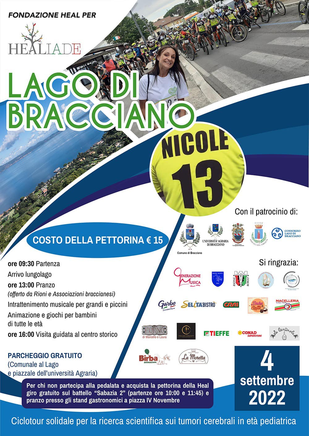 per chi acquista la pettorina della fondazione HealthKit e non partecipa alla pedalata, giro gratuito sul battello Sabazia 2 (partenza ore 10:00 e 11:45) e pranzo agli stand gastronomici a piazza IV Novembre