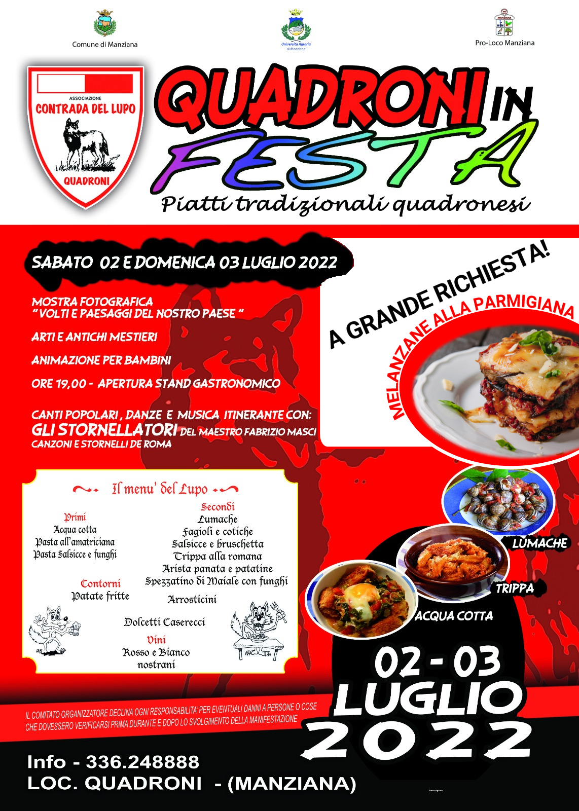 Alle 19:00 è prevista l’apertura dello stand gastronomico con piatti tradizionali quadronesi: melanzane alla parmigiana, lumache, trippa e acqua cotta.