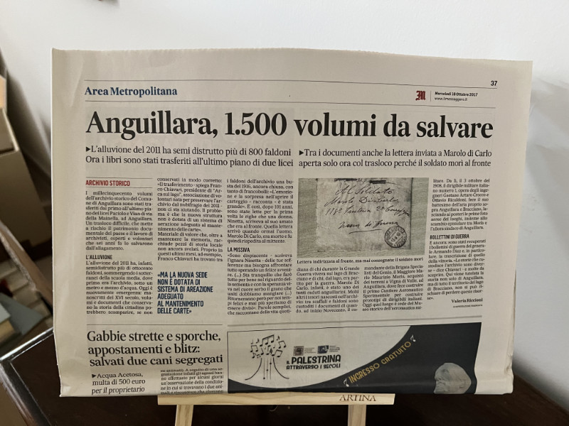 Ieri ho incontrato il presidente dell’associazione Arca sul Lago, Franco Chiavari, nella sede attuale dell’archivio storico presso il Liceo Scientifico Statale I. Vian, in via della Mainella. Durante la nostra piacevolissima chiacchierata mi ha spiegato come i cittadini di Anguillara si siano prodigati nel tentativo di riparare ai danni causati dall’acqua: ognuno ha “adottato” un faldone e, pagina dopo pagina, l’ha asciugato con un foglio di carta assorbente, ripetendo l’operazione per tre volte.