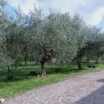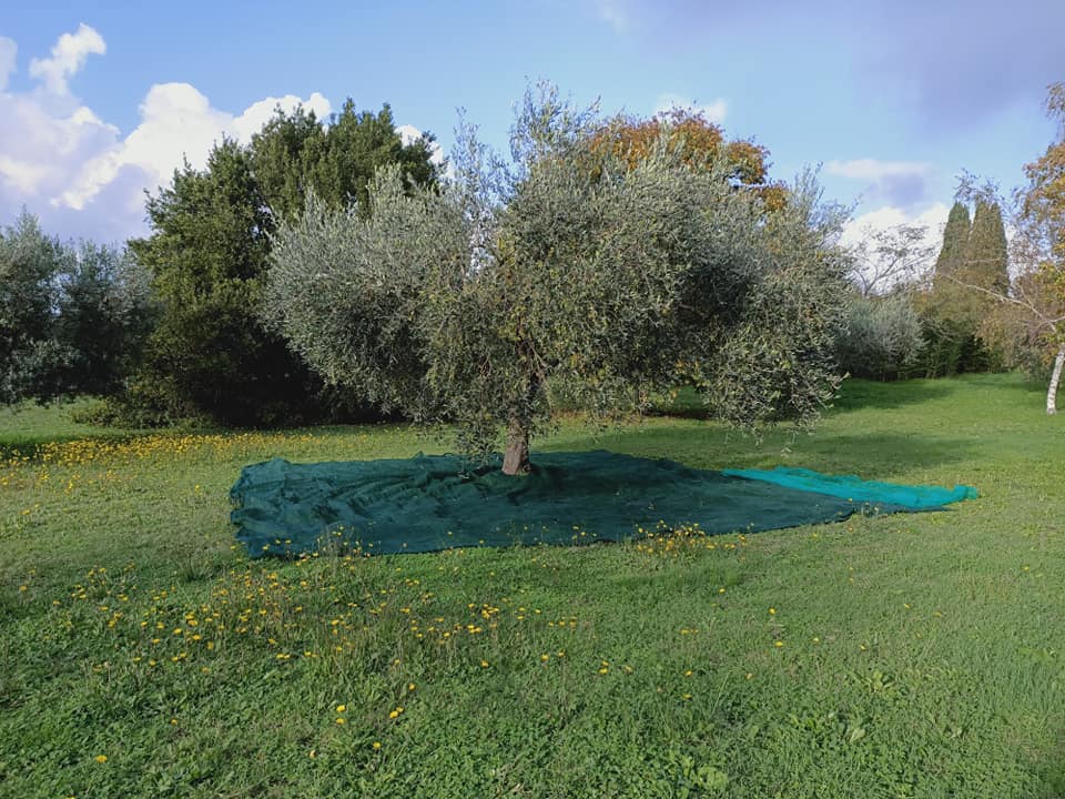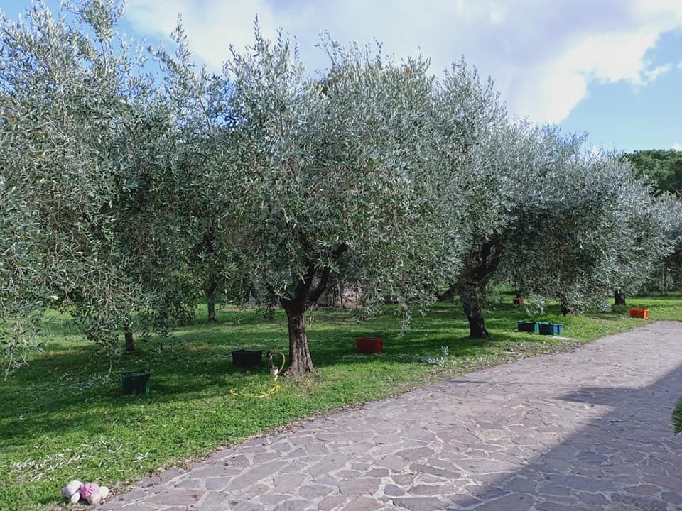 Villa immersa nel verde, circondata da un parco con ulivi, frutteto e animali da cortile.