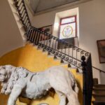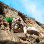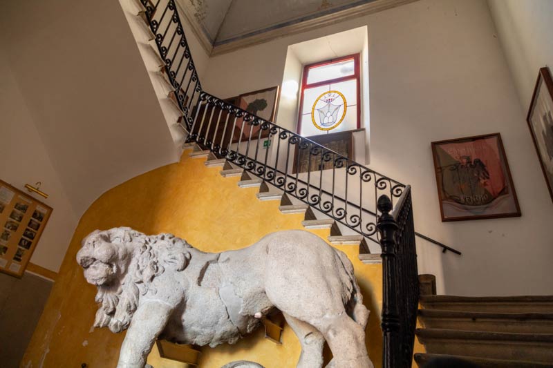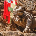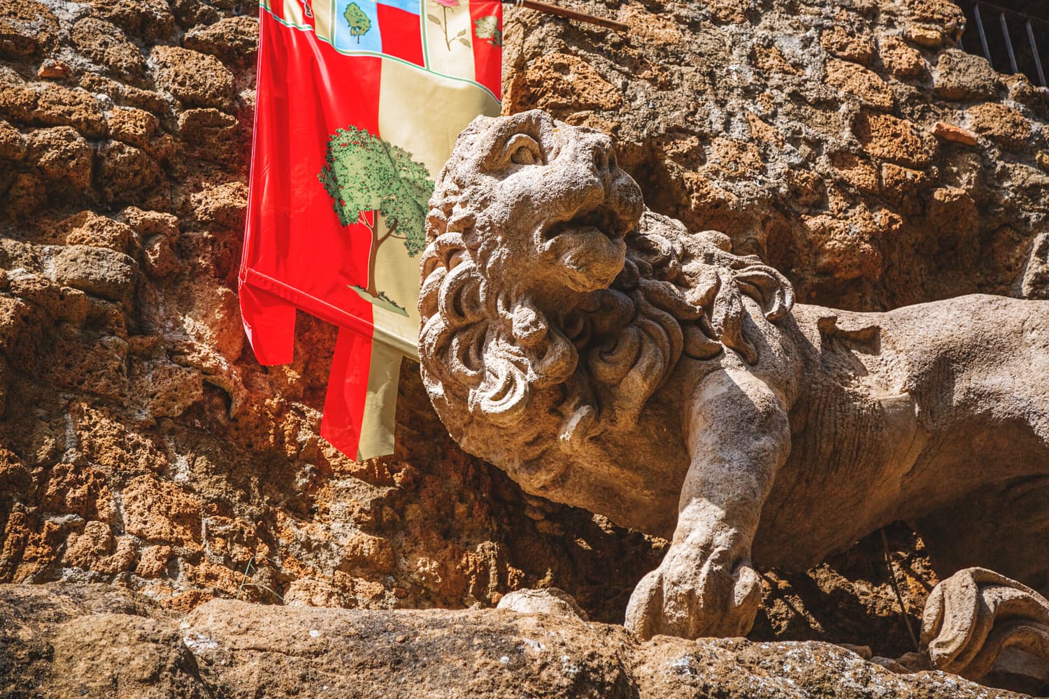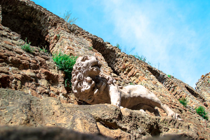 La scultura, collocata alla base rocciosa che sosteneva le mura portanti del palazzo ducale di Monterano, raffigura il leone nell’atto di colpire la roccia con una zampa.