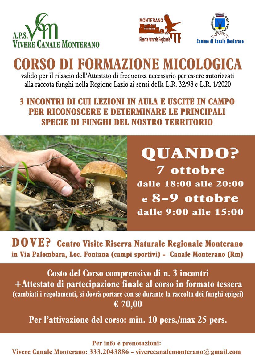 Il Corso è valido per il rilascio dell’attestato di frequenza necessario per essere autorizzati alla raccolta funghi nella Regione Lazio ai sensi della L.R. 32/98 e L.R. 1/2020.