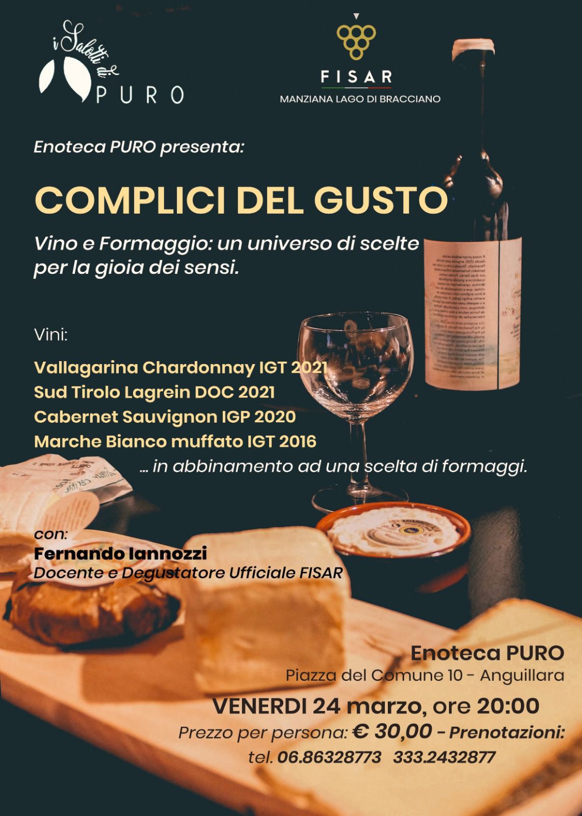 Venerdì 24 marzo ore 20:00 presso Enoteca PURO, piazza del Comune, 10 – Anguillara Sabazia