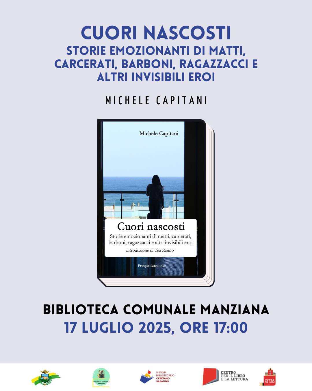 La Biblioteca Comunale di Manziana ospiterà giovedì 17 luglio alle ore 17.00 la presentazione del libro “Cuori nascosti. Storie emozionanti di matti, carcerati, barboni, ragazzacci e altri invisibili eroi” di Michele Capitani, un’opera che spalanca le porte ai mondi marginali della nostra società.