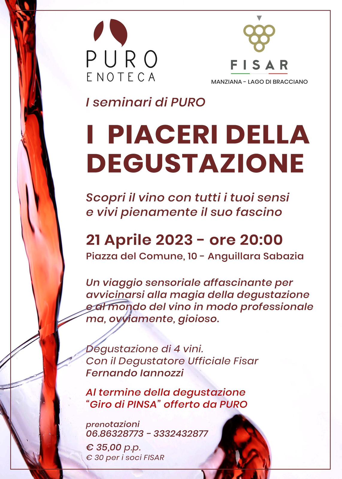 Degustazione di 4 vini. Con il Degustatore Ufficiale Fisar Fernando lannozzi. Al termine della degustazione “Giro di PINSA” offerto da PURO