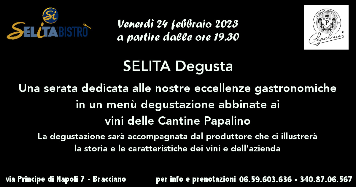 Il produttore Papalino e il personale del Selita Bistró ci illustreranno nel dettaglio il percorso sensoriale tra vini e pietanze