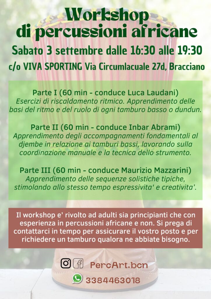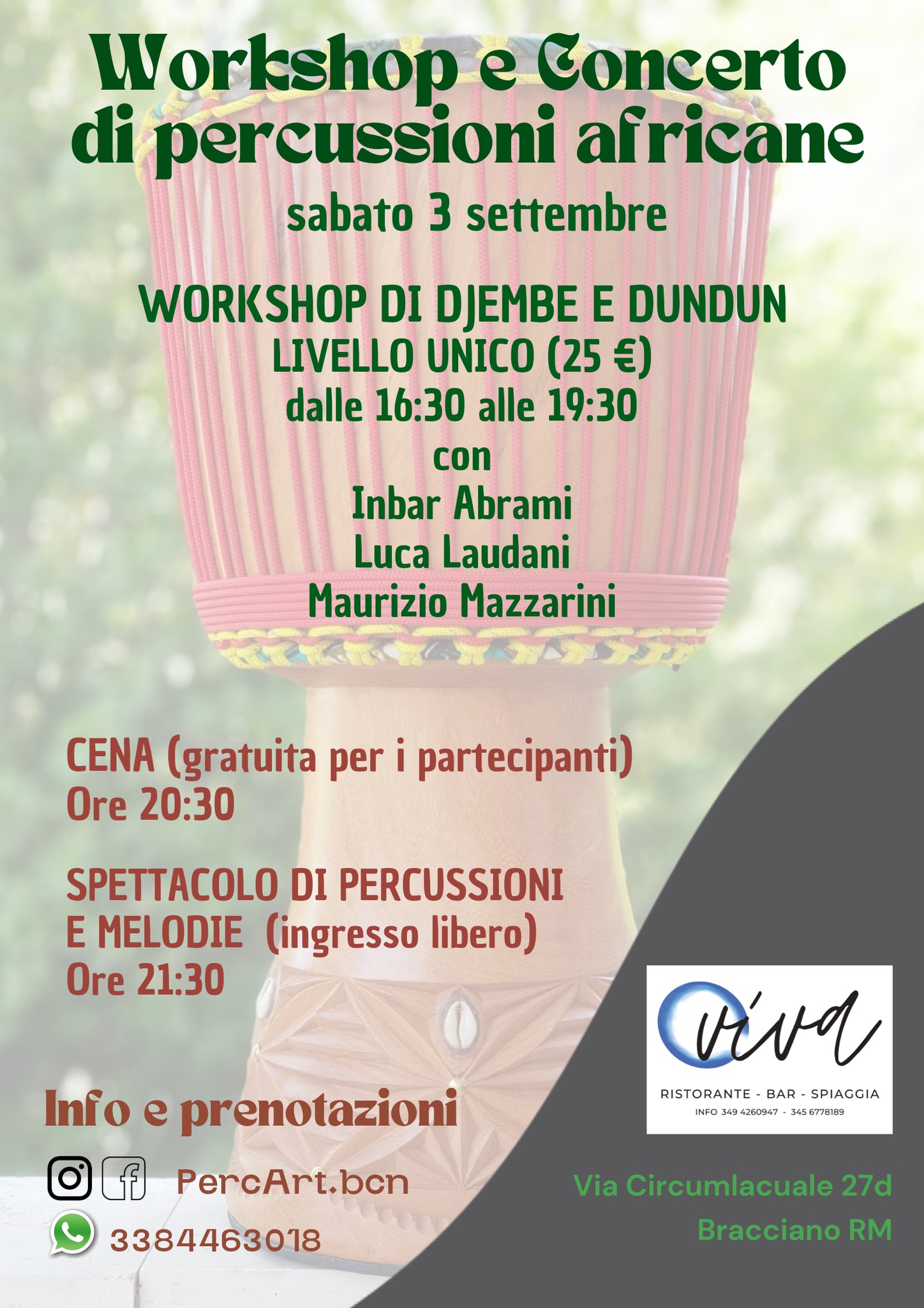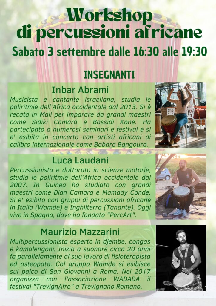 Sabato 3 settembre 2022 dalle 16:30 alle 19:30 , workshop di djembe e dundon (25 euro), Inbar Abrami, Luca Laudani e Maurizio Mazzarini.